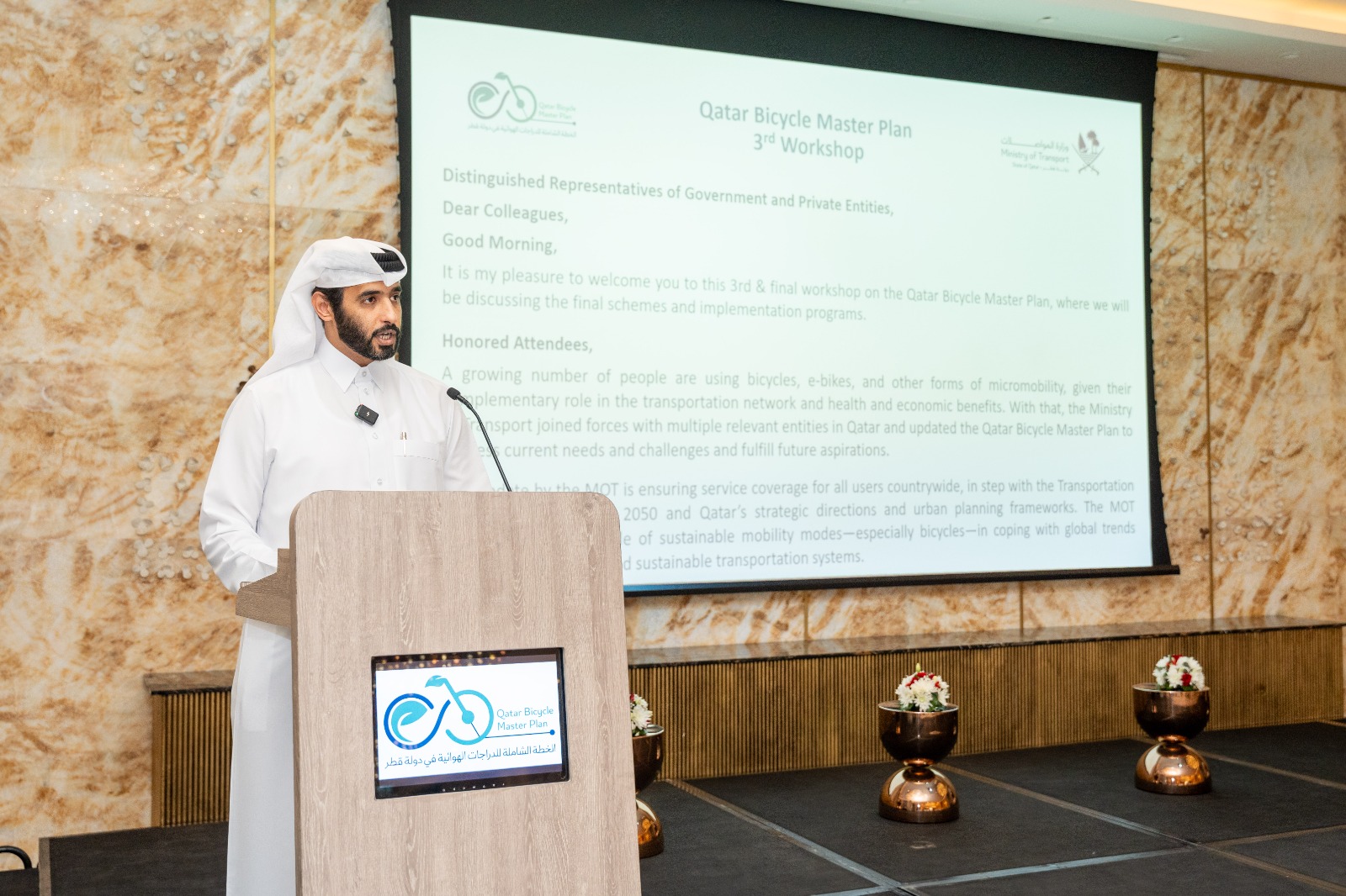 نظّمت وزارة المواصلات ورشة العمل الثالثة والأخيرة ضمن سلسلة ورش العمل التشاورية لمشروع "تحديث الخطة الشاملة للدراجات الهوائية في قطر" ، وذلك بمشاركة واسعة من الجهات الحكومية والخاصة والخبراء والمختصين في مجالات النقل والتخطيط الحضري.