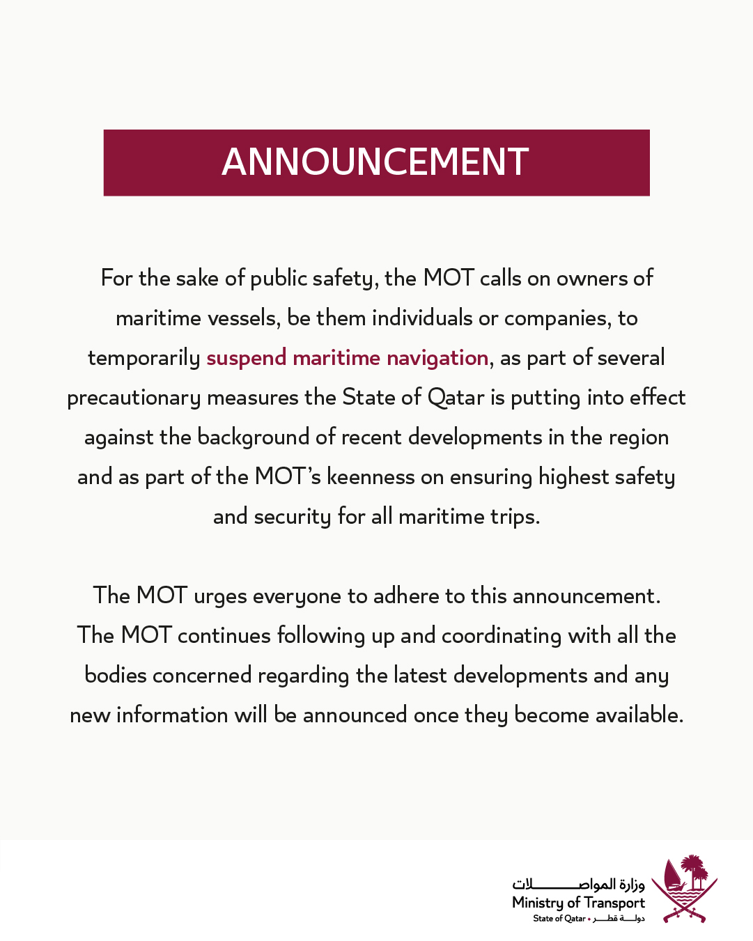 For the sake of public safety, the MOT calls on owners of maritime vessels, be them individuals or companies, to temporarily suspend maritime navigation, as part of several precautionary measures the State of Qatar is putting into effect against the background of recent developments in the region and as part of the MOT’s keenness on ensuring highest safety and security for all maritime trips.