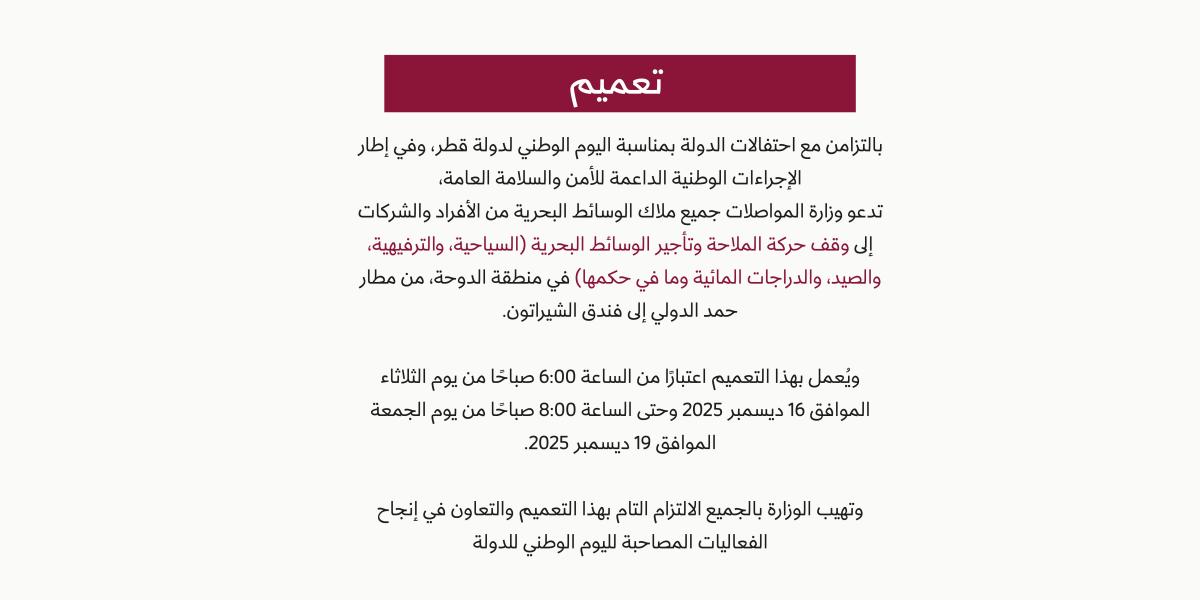 بالتزامن مع احتفالات الدولة بمناسبة اليوم الوطني لدولة قطر، وفي إطار الإجراءات الوطنية الداعمة للأمن والسلامة العامة، تدعو وزارة المواصلات جميع ملاك الوسائط البحرية من الأفراد والشركات إلى وقف حركة الملاحة وتأجير الوسائط البحرية (السياحية، الترفيهية، الصيد، والدراجات المائية وما في حكمها) في منطقة الدوحة، من مطار حمد الدولي إلى فندق الشيراتون.